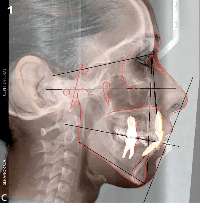 Al hacer la valoración y el examen clínico pudimos observar que se trataba de una sonrisa gingival por exceso vertical del maxilar. Corroborando estos datos con los auxiliares de diagnóstico complementario tales como: cefálica lateral, ortopantomografía, modelos de estudios y fotografías clínicas. (Fig, 1)