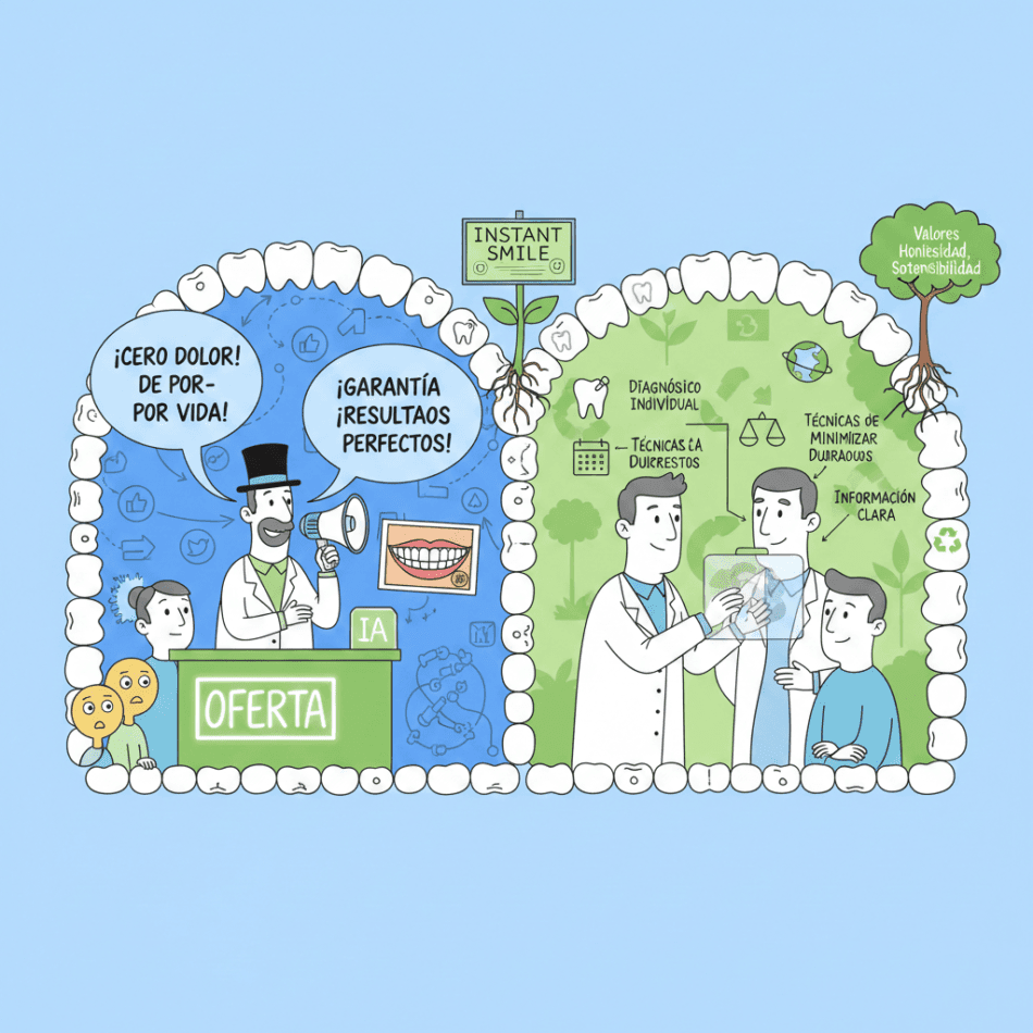 Retomando el punto 1: no ofrecer lo que no se podrá cumplir. Frases como “Cero dolor”, “Garantizado de por vida”, “Un tratamiento inigualable” crean falsas expectativas que al no cumplirse, generan desconfianza.
